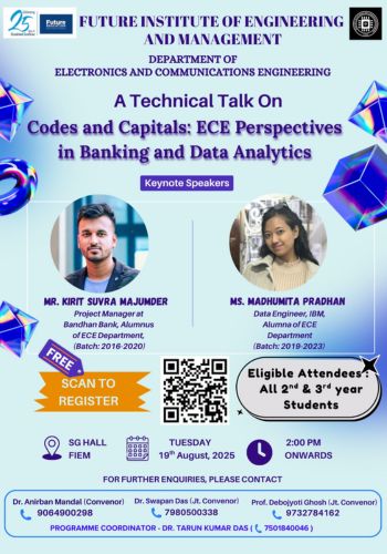 The Department of Electronics and Communications Engineering of Future Institute of Engineering and Management has proudly hosted an engaging Expert Talk titled "Codes and Capitals: ECE Perspectives in Banking and Data Analytics" by their Alumni today at SG Hall, FIEM. Esteemed alumni Mr. Kirit Suvra Majumder (Project Manager, Bandhan Bank) and Ms. Madhumita Pradhan (Data Engineer , IBM) shared their professional journeys and insights into the evolving intersections of ECE, banking and data analytics. This inspiring session was adorned with all B.Tech students where they have got a golden opportunity to learn, connect and become future-ready!