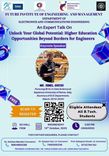 Department of Electronics and Communications Engineering of Future Institute of Engineering and Management organized an Expert Talk on “Unlock Your Global Potential: Higher Education Opportunities beyond Borders for Engineers’. The session, held on 15th October 2025 at SG Hall, FIEM, witnessed an engaging interaction between students and the speaker — a perfect blend of knowledge, motivation, and nostalgia. ECE departmental alumnus Mr. Himel Ghosh, currently pursuing M.Sc. in Data Science at Sapienza University of Rome, Italy, returned to his Alma mater to deliver an inspiring and insightful talk. With confidence, clarity, and passion, he guided his juniors through the pathways of international education, specially in Italy and Germany sharing his real-life experiences, application insights, and career-building strategies.