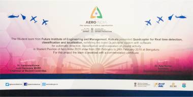 In this esteemed national competition, a group of four students from 3rd year Electrical Engineering Department of Future Institute of Engineering and Management have got the opportunity to present their project in the AERO INDIA 2019 event at Bengaluru. The project was selected among the top 6 projects from all over India.