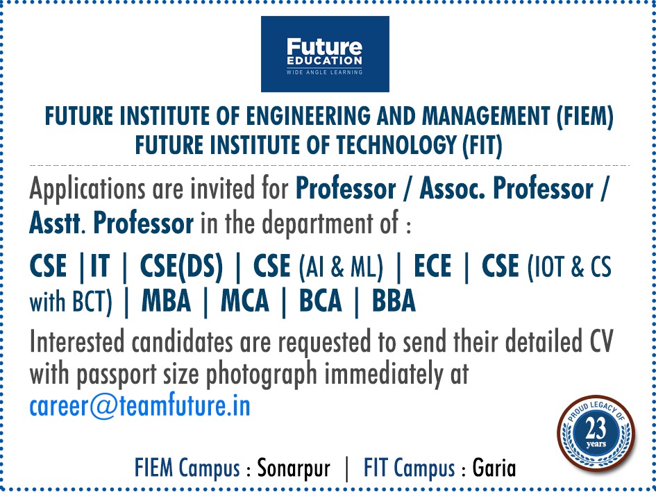 We invite zealous and proficient subject teachers, efficient administrators, staff members, technicians and distinguished academicians to build a modern technological knowledge hub in the top management colleges in Kolkata.